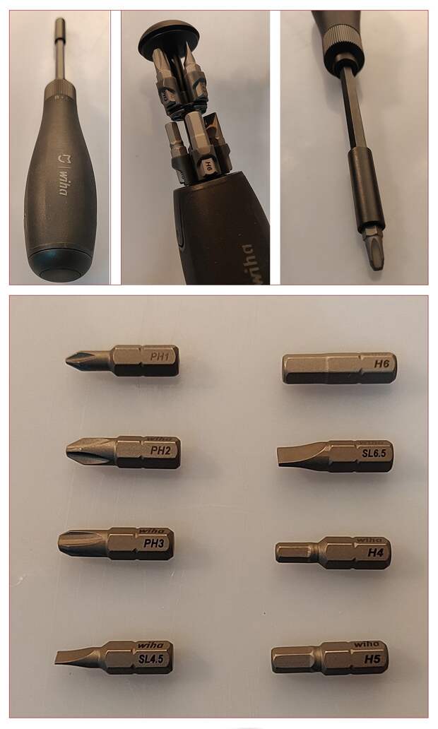 В комплекте 8 бит и удлинитель для них. В рукоятке отвертки специальный выдвижной отсек, где хранятся биты. В комплекте крестовые биты, шлицы и шестигранники. На рукоятке установлен переключатель направления вращения с трещоткой. Длина отвертки (в собранном виде вместе с удлинителем) — около 25см.